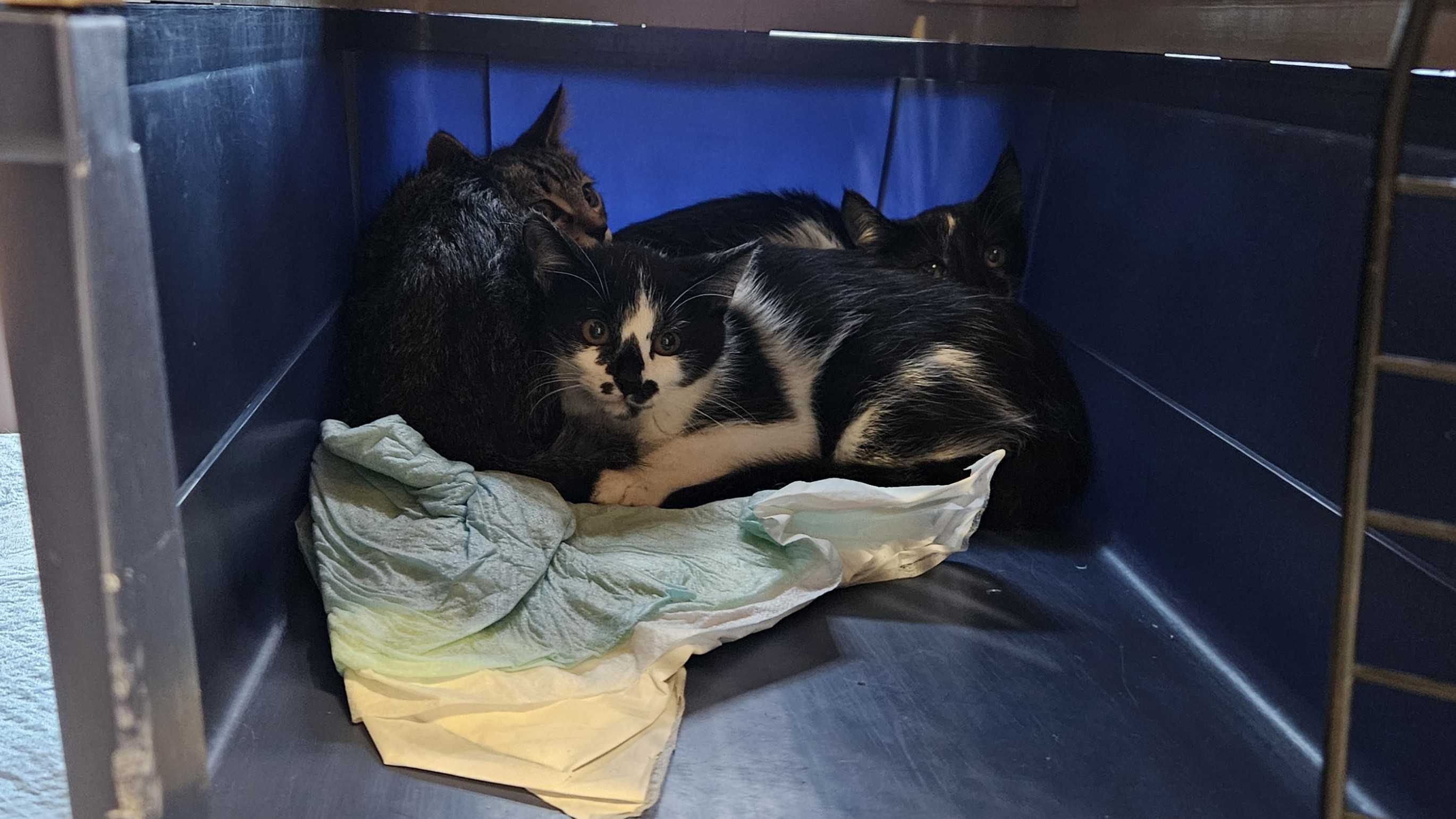 子ねこたちはケージからは出てきたものの、なんとチェストの下のこんなスペースに入ってしまいました😲