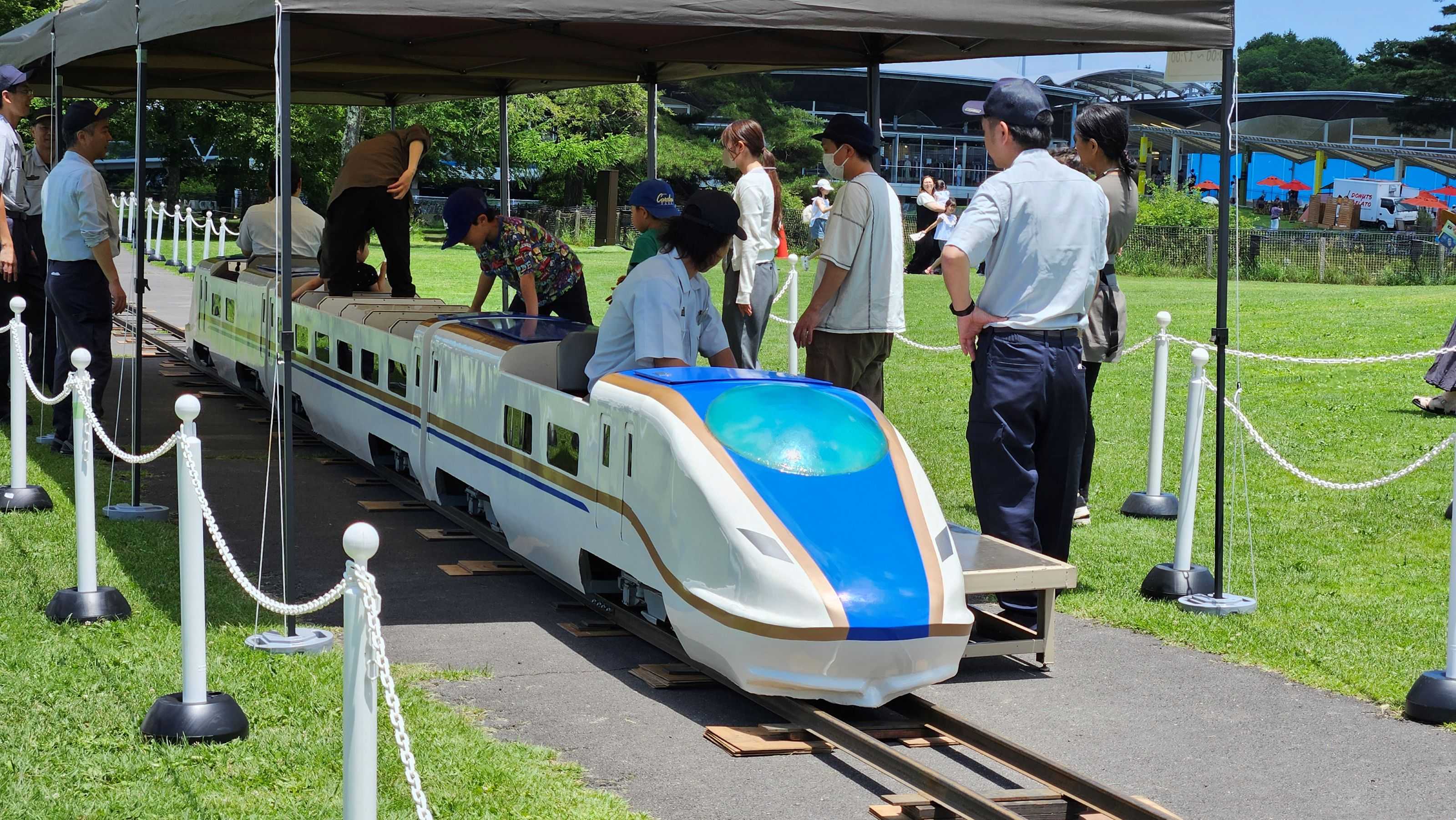 どこへ行ったのかと思ったら、JR東日本の方のお話を伺っている後ろをミニ新幹線E7系に乗ってしかも後ろ向きに通り過ぎるのがこの隙間から見えました。。