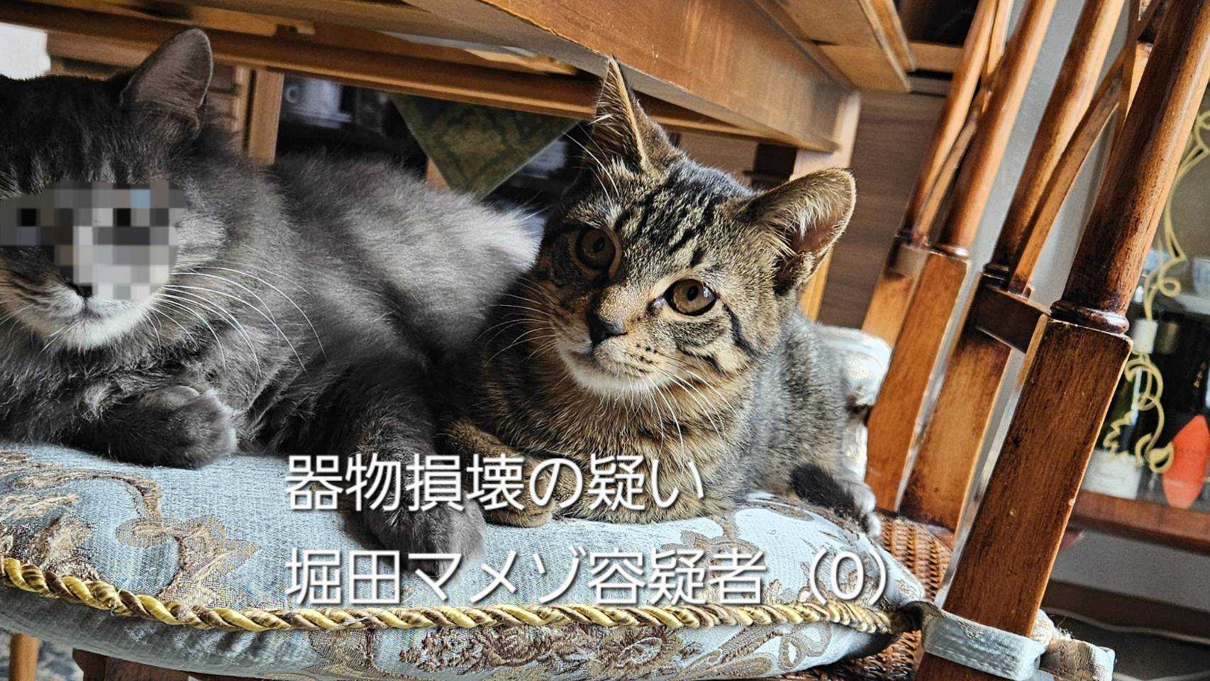 事件です!!最近、一番小さいネコがかなりやんちゃになってきているので家の中が結構大変なことになっています。。 で、こんな感じでお伝えしようと思います。 今朝早く、長野県軽井沢町の住宅で壁紙がはがされているのをこの家の住民が発見しました。 カベをよじ登りながら壁紙がはがされたとみて、警察は近くに住む堀田マメゾ容疑者(0)を任意同行し、その後器物損壊の容疑で逮捕しましたwww