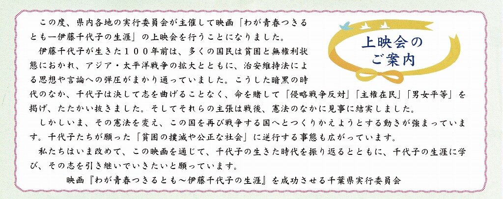 伊藤千代子の生涯久しぶりに映画を見た。 「わが青春つきるともー伊藤千代子の生涯ー」という。 涙無しには見終えることが出来無かった。 どういう人物だったのかは私が解説するより、3枚目の解説をお読み頂きたい。僅か24才で拷問と劣悪な獄中環境のため肺炎で夭折した人物である。存在さえ知らなかった。 当時弾圧した側の人物、勢力は、敗戦によって消えたかに見えて、大きな政治勢力の都合によって蘇り、謝罪どころか反省も無いまま今日に至っている。今又様々な新事実が公になる中、妖しげな雰囲気が漂う。