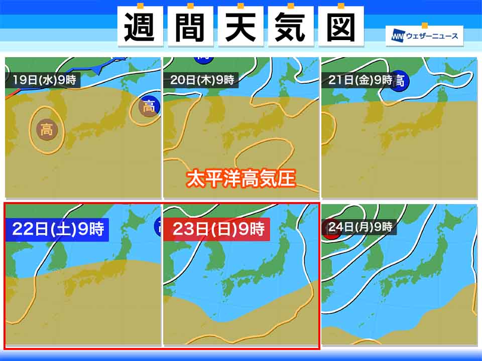 危険な暑さは21日(金)頃まで 次の週末から暑さは落ち着く西日本や東海を中心とした危険な暑さは21日(金)頃まで続く見込みです。次の週末になると太平洋高気圧が勢力を弱め、ようやく暑さが落ち着いてきます。weathernews.jp