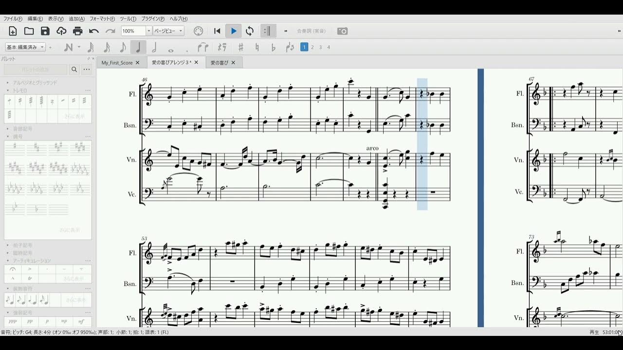 カルテットの先生から入手したクライスラーの【愛の喜び】をフルート、ファゴット、ヴァイオリンとチェロの四重奏用にアレンジしているという話をしました。