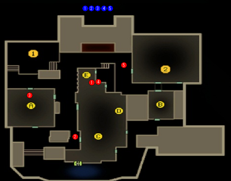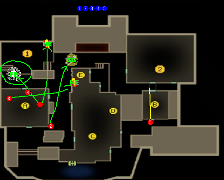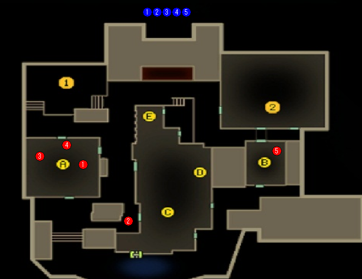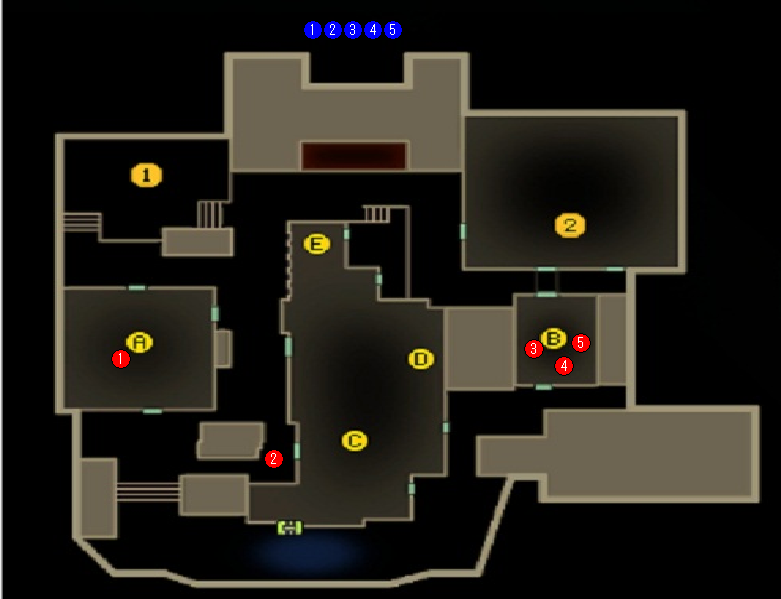⑤は裏詰め警戒+裏取り狙い等。こいつがかなり敵からすれば厄介なはず。相手のシフトを狙って裏どりもできる。スモークやフラッシュで相手のシフトを遅らせて屋上を開けたりするとかなり相手からすればだるい。
