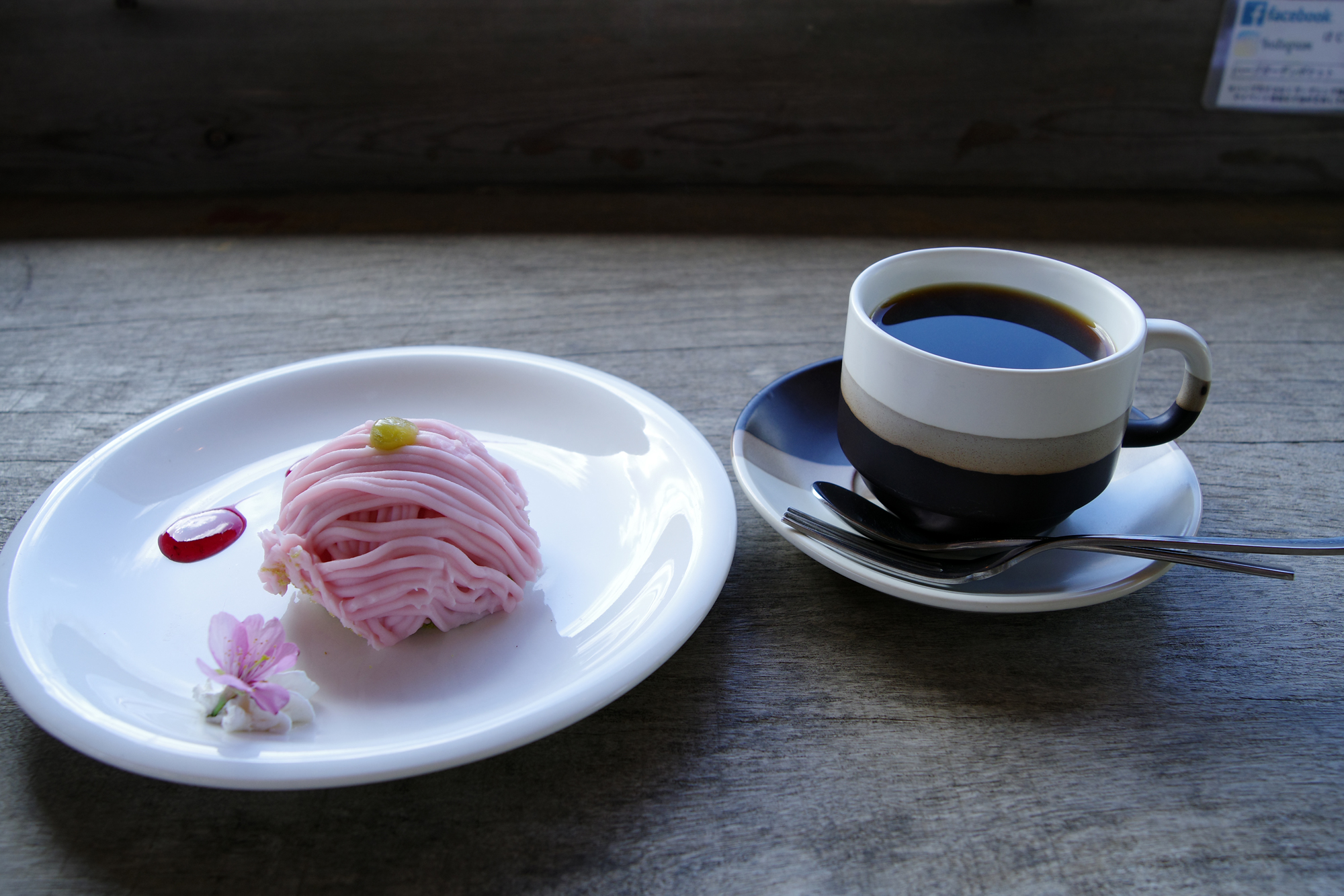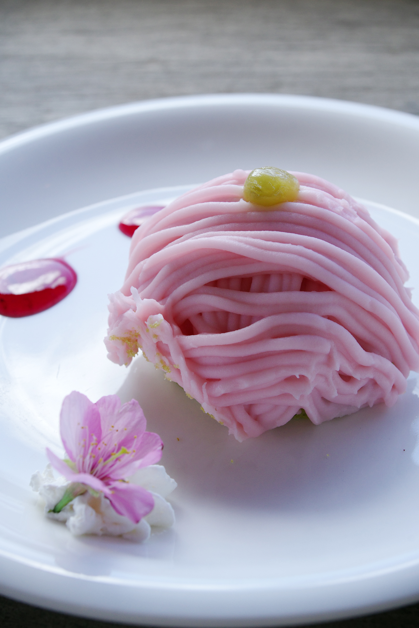 このモンブランの淡いピンクと苺のソース、小脇の桜の花びらが絶妙に映えますね。