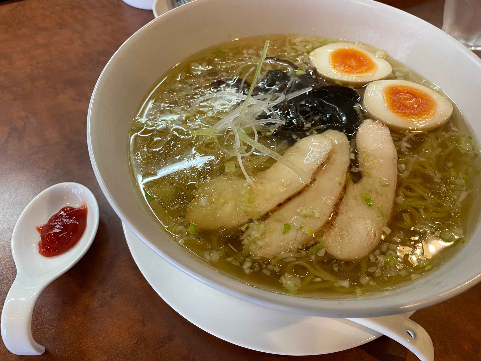 今日はシンプルに塩ラーメン。春は味変で梅ペーストか柚子ペーストを付けられます。