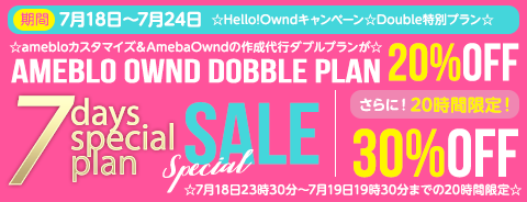 超お得! アメブロカスタマイズ キャンペーン AmebaOwndのカスタマイズとアメブロのカスタマイズを同時に行う、【Ameblo&Ownd Dobble】が期間中の7日間の間にオーダーいただいた方に限り20%オフ!さらに、期間を絞った、7月19日の19時間だけ30%オフになる!