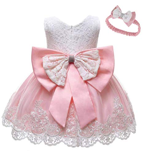 [ミシアラグジュアリー] ヘッドバンド付き ベビードレス ドレス 大きいリボン パーティードレス レース シフォン 衣装 ホワイト×ビーンピンク 6month