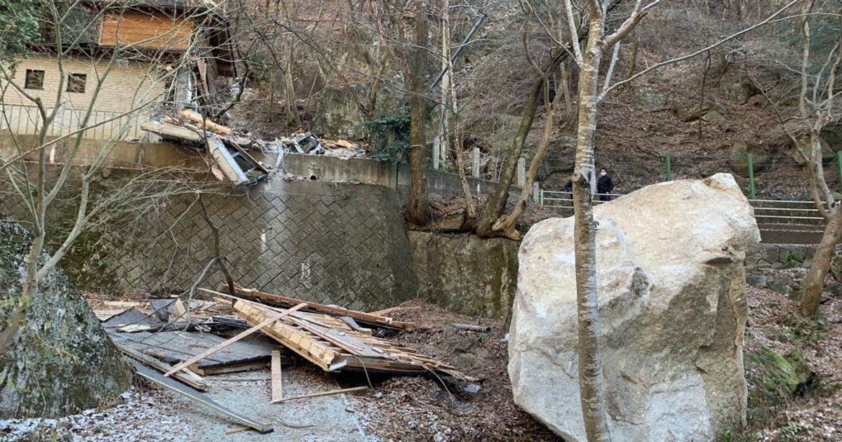 市によると、渓谷を流れる荒川に一辺の長さが最大約5メートルの落石とみられる岩があり、遊歩道上にも一辺約1・5メートルの岩があった。公衆トイレは壁などが壊れ、荒川に落ちた岩が直撃したとみられる。