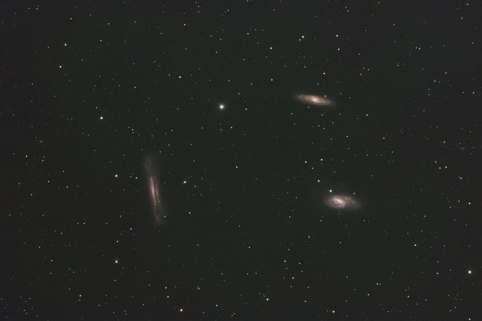 そーいや、最近しし座のM65に超新星が現れたと、いろんな方のブログで見たので、M65を撮ることしました。撮影鏡筒のED103Sで、約800mm。焦点距離が短いので、余裕でトリオが入るので、そんな構図で撮影開始。