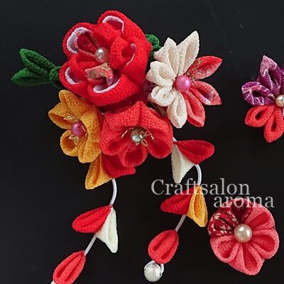 集中ライセンスレッスン最終作品は、基本の丸摘み、剣つまみ、重ね丸、角バラの4種類を組んだ七五三用の髪飾りです![]()
