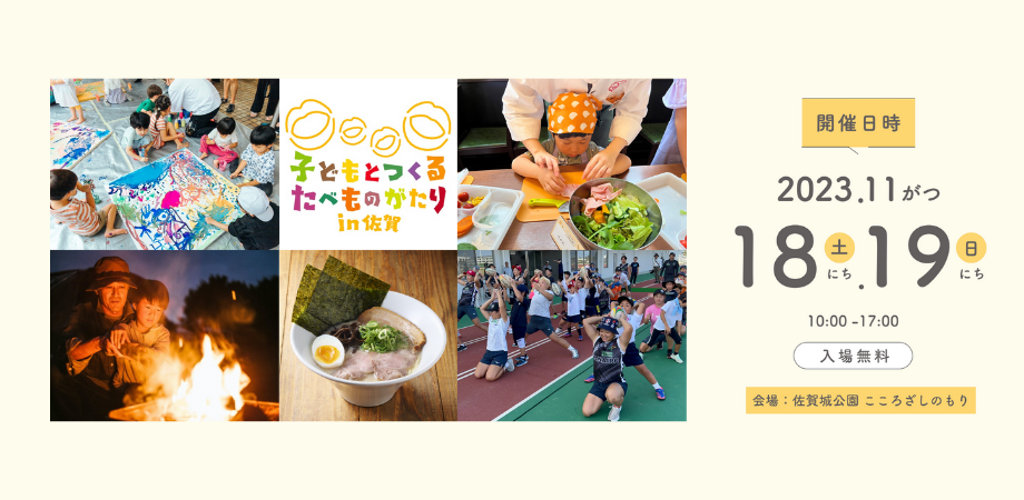 2023年11月18日(土)・19日(日)10~17時、佐賀城公園こころざしのもり(佐賀県佐賀市)で、親子で体験できるワークショップやステージコンテンツ、フードトラック、マルシェなど50以上が出店するイベント、親子向け体験型フードフェス「子どもとつくる たべものがたり」を開催いたします。