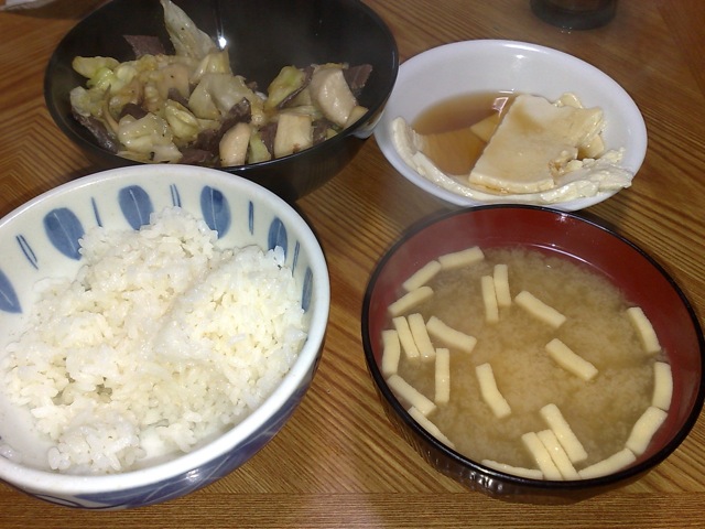 キャベツとエリンギと牛肉炒め、湯葉豆腐。