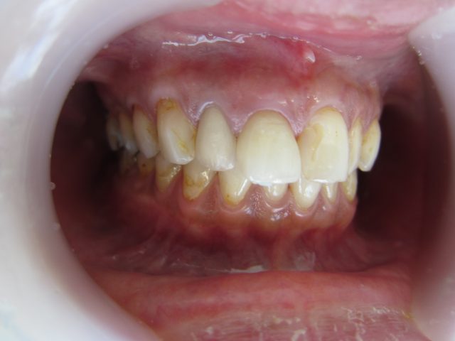 上の前歯の先端が変色しており、歯並びも出っ歯のようになっています。