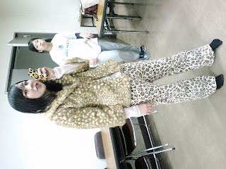 持参のひょうがら?ズボンを身にまとう