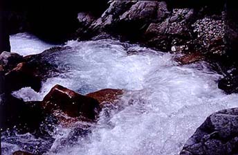 次のポイントで良型の岩魚が出た。しかし渓相は良いのだが岩が赤茶け、およそ100メートル位で全く当りが無くなってしまったから、悪水の話は本当らしい。この辺りで釣りを諦めテントに戻ることにする。