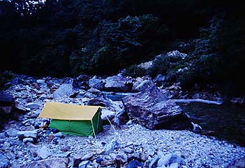 以前より良いサイトがないようでサイト探しに難渋する。私達はその大型テントから上流にわずかばかりの平地を見つけ整備して小さなツエルトを張った。小さいの二人と私だからツエルトでもなんとか眠れるだろう。家でリハーサル済みであるから。