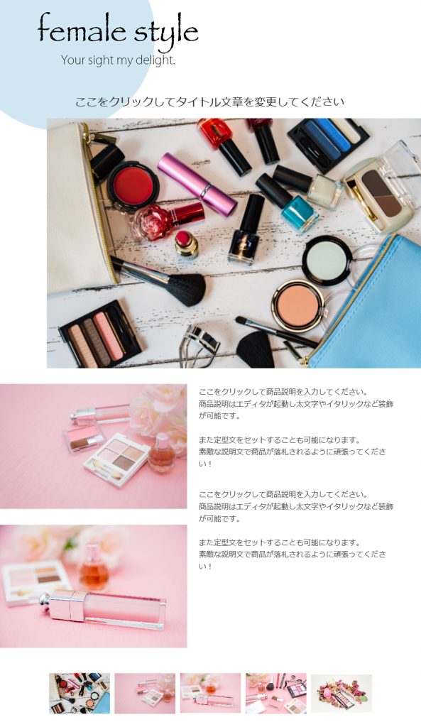 化粧品の写真と合わせるとシンプルかつ清潔感のあるテンプレートに…。