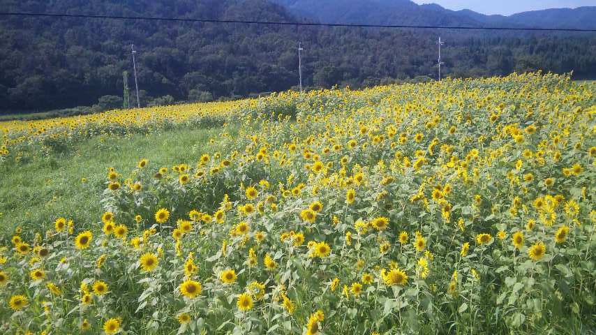 燦々と。この前の日曜日、滋賀のガリバー青少年旅行村でキャンプをするべく移動中、突然!!ひまわり畑に遭遇!と共に、一時停車。こういうのは、テレビのコマーシャルとかでしか見たことがなかったもんで、実際見るのは初体験。夏らしくて良いでしょ。キャンプ場に着くまでの、粋なお出迎え。元気を分けてもらえたような気がしました。