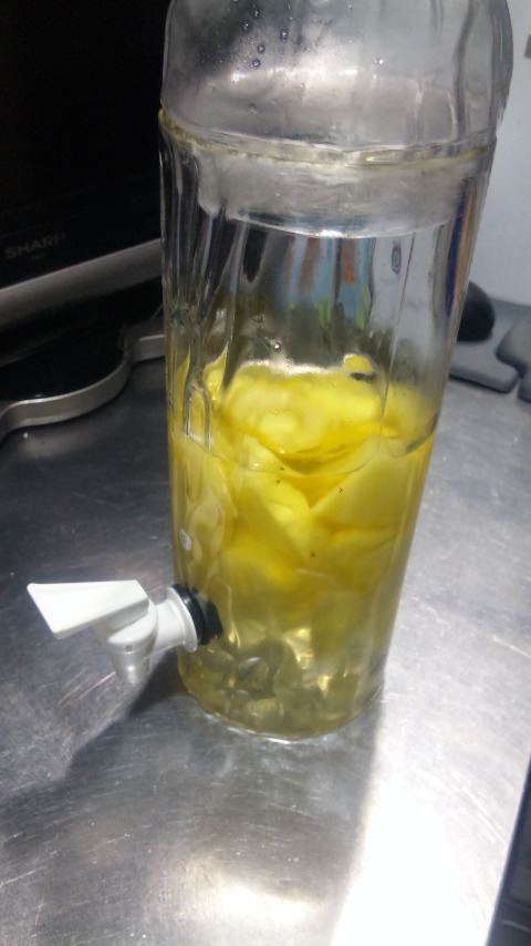 パイン酒製作。 先日、サントリーよりウオッカの巨大なボトルを頂戴しました。 以前より、お客様に「作ったら?」と言われていた、 果実酒作りに挑戦! 差し当たって、無難にパイナップル 漬け込んで4日目ですが、ほんのり黄色がかり、パインの甘~い香りが漂ってます もう少し経てばいい感じに仕上がると思われます 乞う、ご期待!