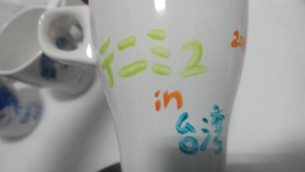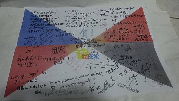 こののぼりが知りませんの人があるかもしれません。じつは、このイメージは四天宝寺台湾公演のとき、キャストの皆さんにプレゼントで差し上げるのテニミュ台湾交流会のTシャツのイメージとおなじです。これは四天宝寺台湾公演のまえにせいさくしました。そして、公演のあどて、台湾にきたの齋藤工さんと桐山漣さんのサインがあります!