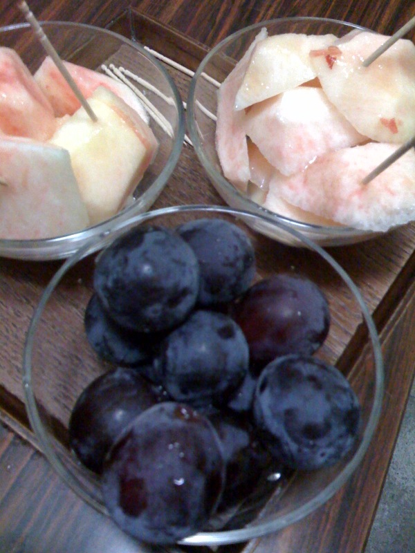 フレッシュ。。昨日、差し入れでもらった、桃とブドウ!スタッフみんなで頂きました~!!久し振りに果物を食べた気がする。。ありがとう!!桃の皮を包丁で剥いたんだけど、剥いたところがツルツル滑って、剥きにくい事が判明!!(笑)