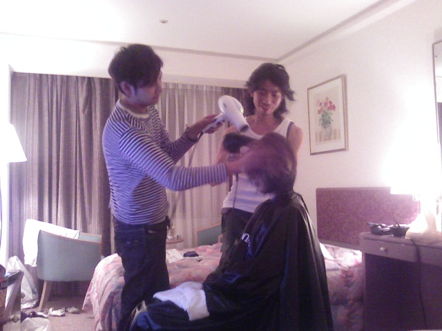 中継第2弾!!。。昨日、ブリーチをして色を抜いてたけど、モデルさんの仕事上、1日、黒染めスプレーをした為、再度、カラーに励むマリノア店陣内くん。手の空いてるスタッフはみんな、お手伝いです。。でも、何より、モデルさんに感謝です!!!こんな時間まで………。。以上、マリノア店陣内くん、春日モール店波多野くん部屋よりお伝えしましたぁ~~~!!