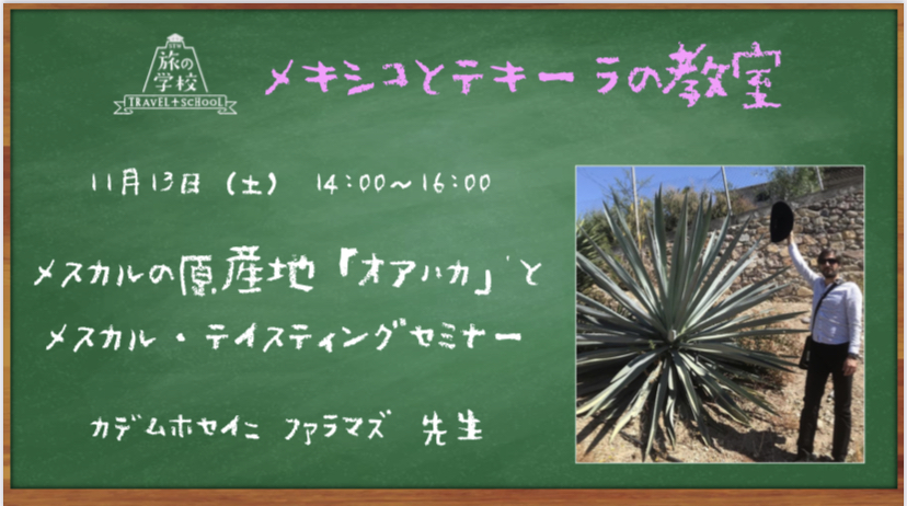 11月13日(土) に「旅の学校メキシコとテキーラの教室」の特別企画としてメスカルテイスティングセミナーを開催します。