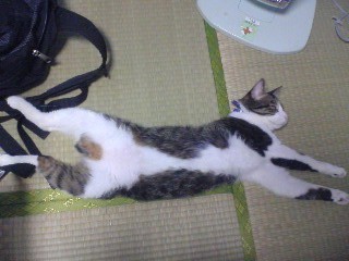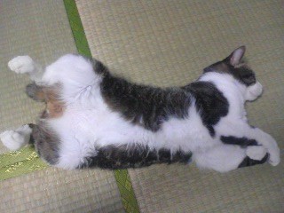 今日のぽむ 8ども、今日(っていうかもう昨日)さっそくバイトを来年の1月末で辞めることを伝えてきた私です。看護副部長さんは残念がっていたのですが(人手が足りなくなるから)、それでも「学業が優先やからね」とおっしゃってくれました。ありがとうございます。本当に優しい副部長さんです。久しぶりに今日のぽむ再開します。ぽむは本当に変な格好をよくするのですが、今さっきも変な格好をしておられました。それがこれです。畳の上ですけど、何となく飛んでるみたい。あと、以前にこんなのも撮りました。若干キョンシーっぽい。これね、足上げて寝てるんですよ。どんな寝方やねん。あと、おまけに。ぽむの置物です。棚に飾ってるんです。それではまた。