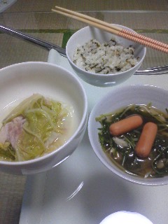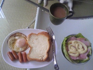 パンは昨日ホームベーカリーで作りました。何か無性にパンが食べたくなってしまいまして…。あ、それと端っこに写ってるのは食べ物じゃありません(←わかっとるわ)。ぽむです。これ見たら、パン以外はまたしても手抜き料理やな…(いや、パンも材料入れてスイッチ押すだけやしある意味手抜きか…)。まいっか。おいしかったし。