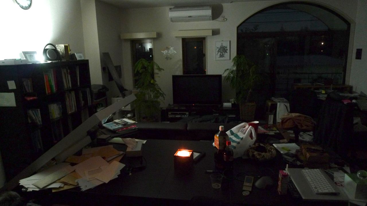 電気は蛍光灯にし、コートを着て暖房を消しています。