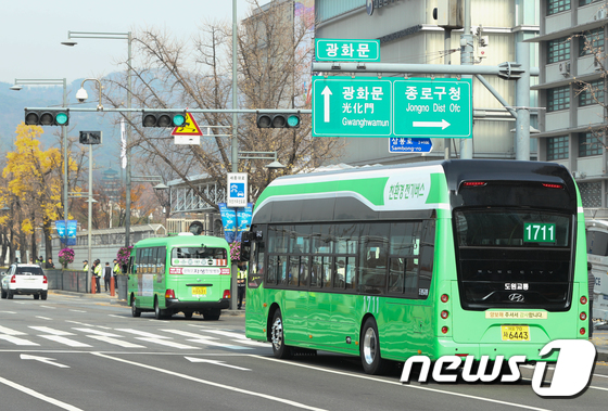 2018年11月、ソウル世宗路光化門交差点近くで、ソウル市初の電気バスが運行されている。2018.11.15 /ニュース1©News1シンウンス記者