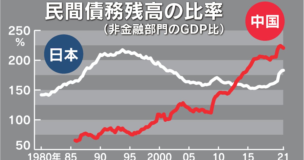 >中国の民間債務残高の国内総生産(GDP)比は220%に達し、日本がバブル崩壊直後につけたピーク(218%)を上回る。融資残高全体に占める不動産向けの割合も今の中国が3割弱と、21~22%台だった日本のバブル期より高い。