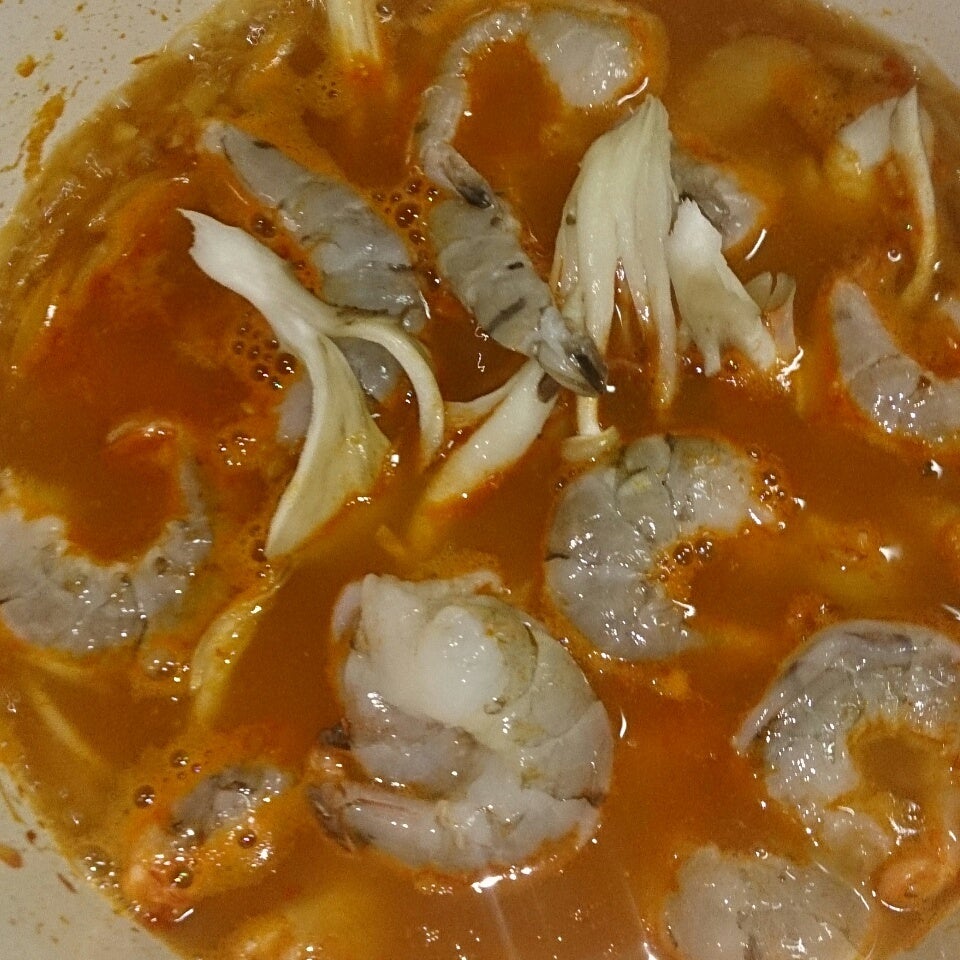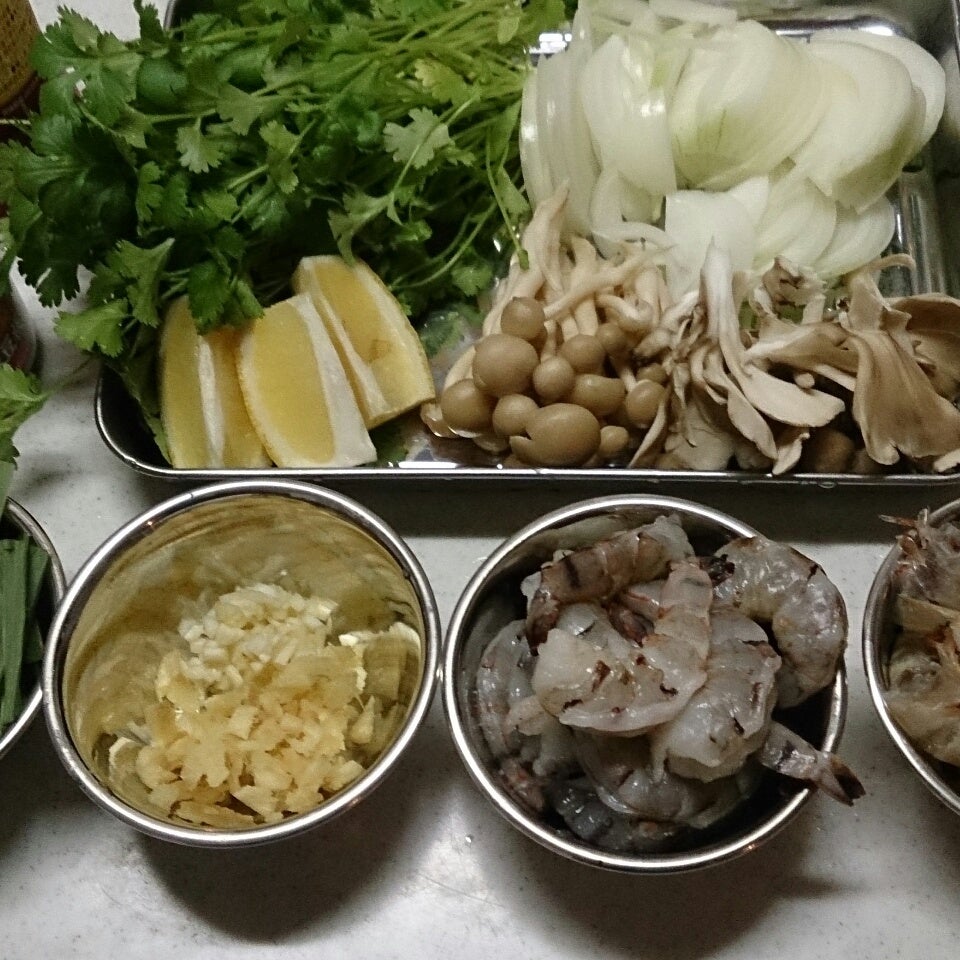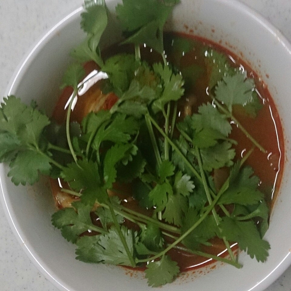 ベランダ栽培のパクチーが育ったので、トムヤムクンにしました。とれたてのパクチーがいいにおいです(*´∀`)