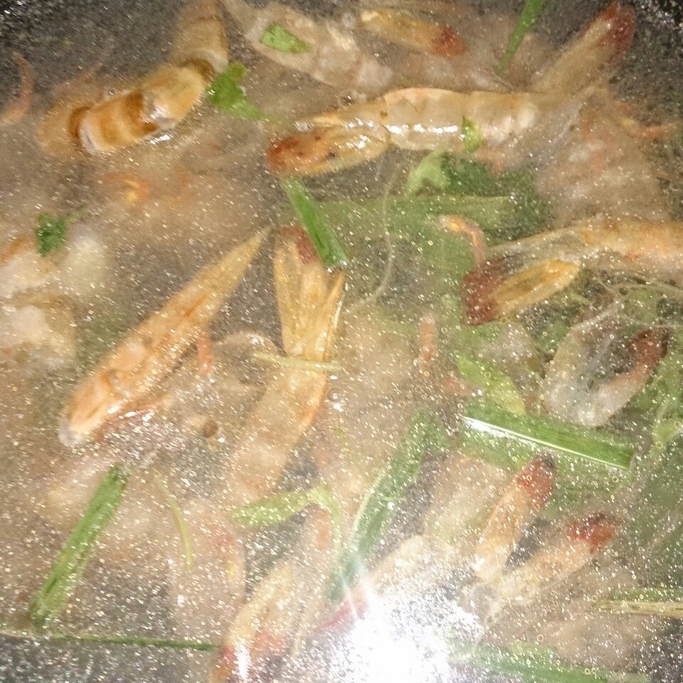 鍋に胡麻油をひき、パクチーの根っこ、レモングラス、海老の殻をいためる。
