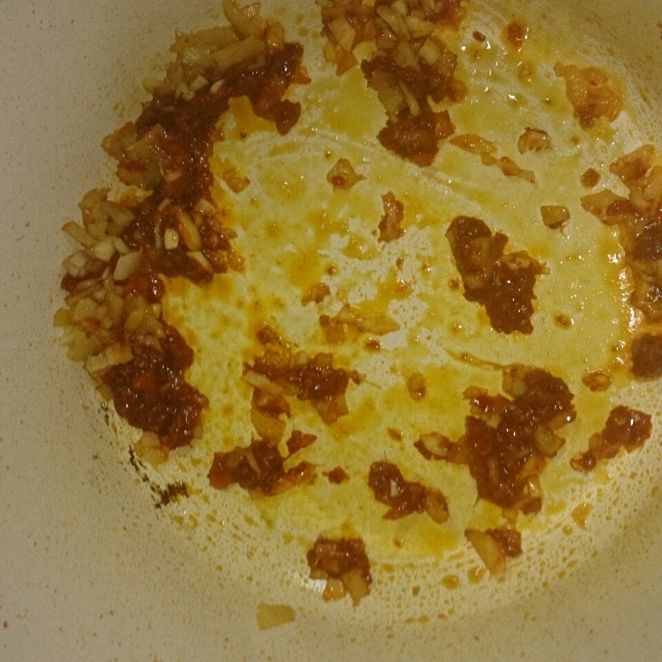 他の鍋に胡麻油をひき、ニンニク、しょうが、豆板醤をいれいためる。