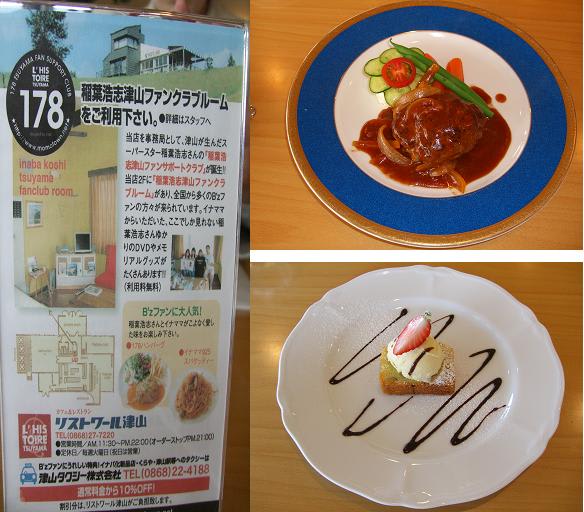 岡山空港 に到着した荒スポは、早速レンタカーを借り一路、津山へ……。広島県「福山市 」なのに岡山県「津山市 」、ここがいつもと違う点。サクラの鶴山公園で有名な津山市ですが、もうひとつ名物……いや有名人がいます。そう、「B’z の稲葉氏」。「稲葉さんロードマップ」という地図も作成されている本人公認?の観光スポットです。そのマップにならい、先ずは実家でお母様が経営している「イナバ化粧品店 」(外観 )へ。狭小路地のため駐停車ができず、外観の撮影となりましたが、特派員(撮影者)いわく、店舗には自由に入られるらしいとのこと。約5分の滞在時間でしたが、2組のファンを確認しました。次に「リストワーレ津山 」(外観 )へ。ここはマップに載っていませんが、1階では稲葉さんが愛して止まない「178ハンバーグ 」が食べられ、2階にはファンが愛して止まない「稲葉ルーム 」があります。ここが一番のオススメでしょうか、長く滞在しても飽きないと思います、一日中いても。デザートが欲しくなったら「旬菓匠くらや 」(外観 )へ。マップにも載っているお兄様が経営されている和菓子屋です。旬の素材を使った甘味は絶品です。