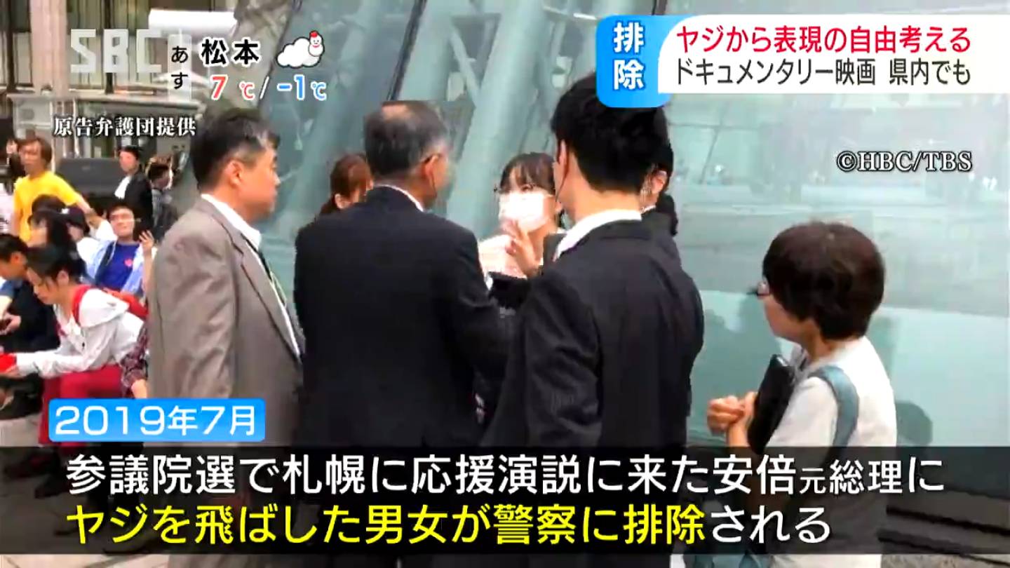「この国ってヤジ飛ばしただけで排除されちゃう国なんだ…?」当時の安倍総理にヤジを飛ばして排除、ロシアや中国のニュース映像?それくらい衝撃!「私何の法律に違反してるの…?」表現の自由とは…ドキュメンタリー映画上映へ | SBC NEWS | 長野のニュース | SBC信越放送2019年、北海道で、当時の安倍総理大臣にヤジを飛ばした市民が排除されるという問題が起きました。「表現の自由」とは何か?「ヤジ排除問題」から民主主義を考えるドキュメンタリー映画が、長野県内でも上映されま…newsdig.tbs.co.jp