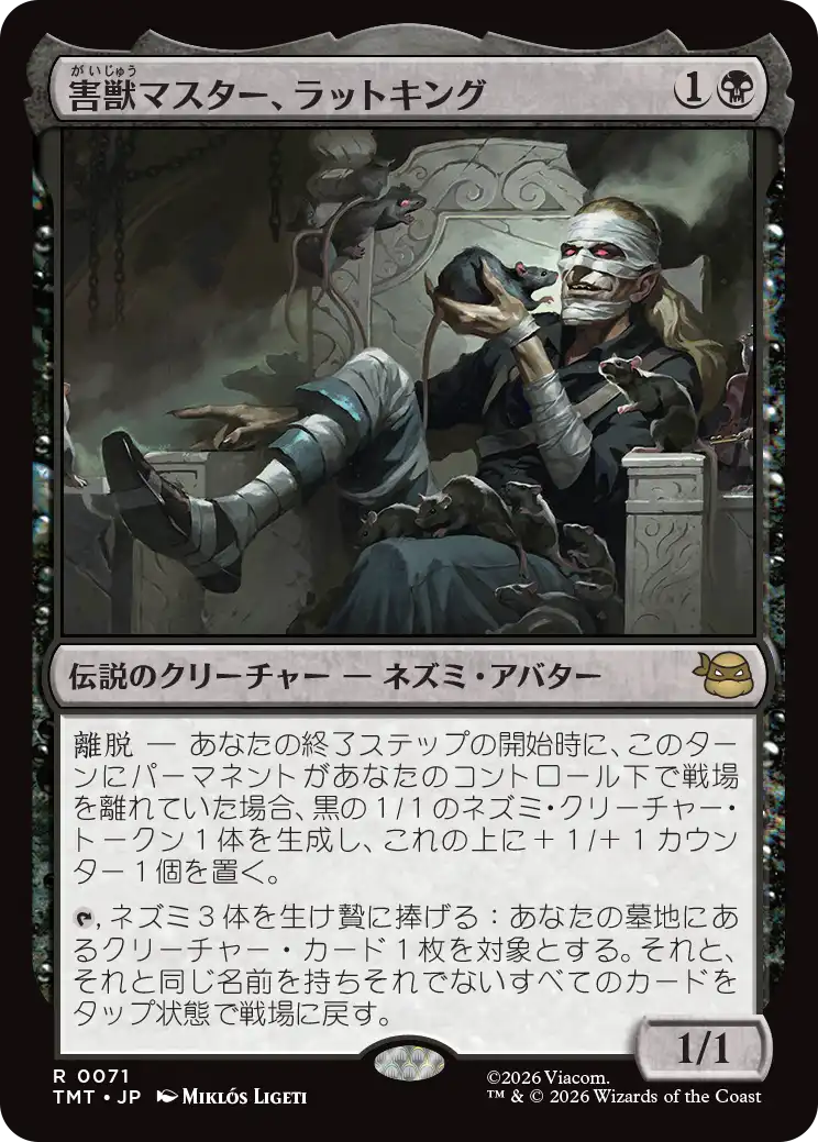 【ミュータント タートルズ】EDH「害獣マスター、ラットキング」は文字どおりネズミデッキでどうぞ(大量リアニメイトからワンショットキルをしたくなる)。【統率者】MTGの話。   前回の続き。   統率者目線で気になった伝説のクリーチャーが居た。   ●害獣マスター、ラッ…リンクthesonchou.jp