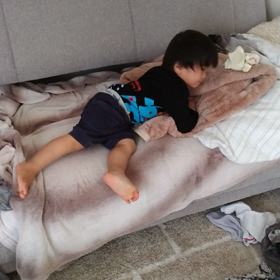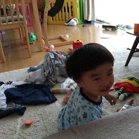アイスを食べる息子くんとぬいぐるみを可愛がる息子くん