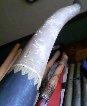 その上最初に聞いてはまったCDが「レゾナンス」(ジェレミー)なのでさあ大変。。このディジュは南オーストラリアからのユーカリ製で結構うねっているので結構こもった音が出てコントロールはしづらい方です。キーは通常ピッタリD(440で)が出ます。うねり曲がっている内部形状なのでトゥーツは遠いですね。マウスピースは大きい方で音色変化循環呼吸共に難しいです。比較的内側の容積も太くなくベルボトムでもないのでコールも遠くに飛びません。使いづらいディジュですが音楽的にコントロールがどうのと言った事を越えた思い入れが有ります。なぜかディジュに関しては楽器としての性能における優劣と全く別の観点での善し悪しの基準が有るようで吹きづらいけど気持ちいいディジュ、とか吹きやすいけど気持ちが入らないディジュとか有るようです。