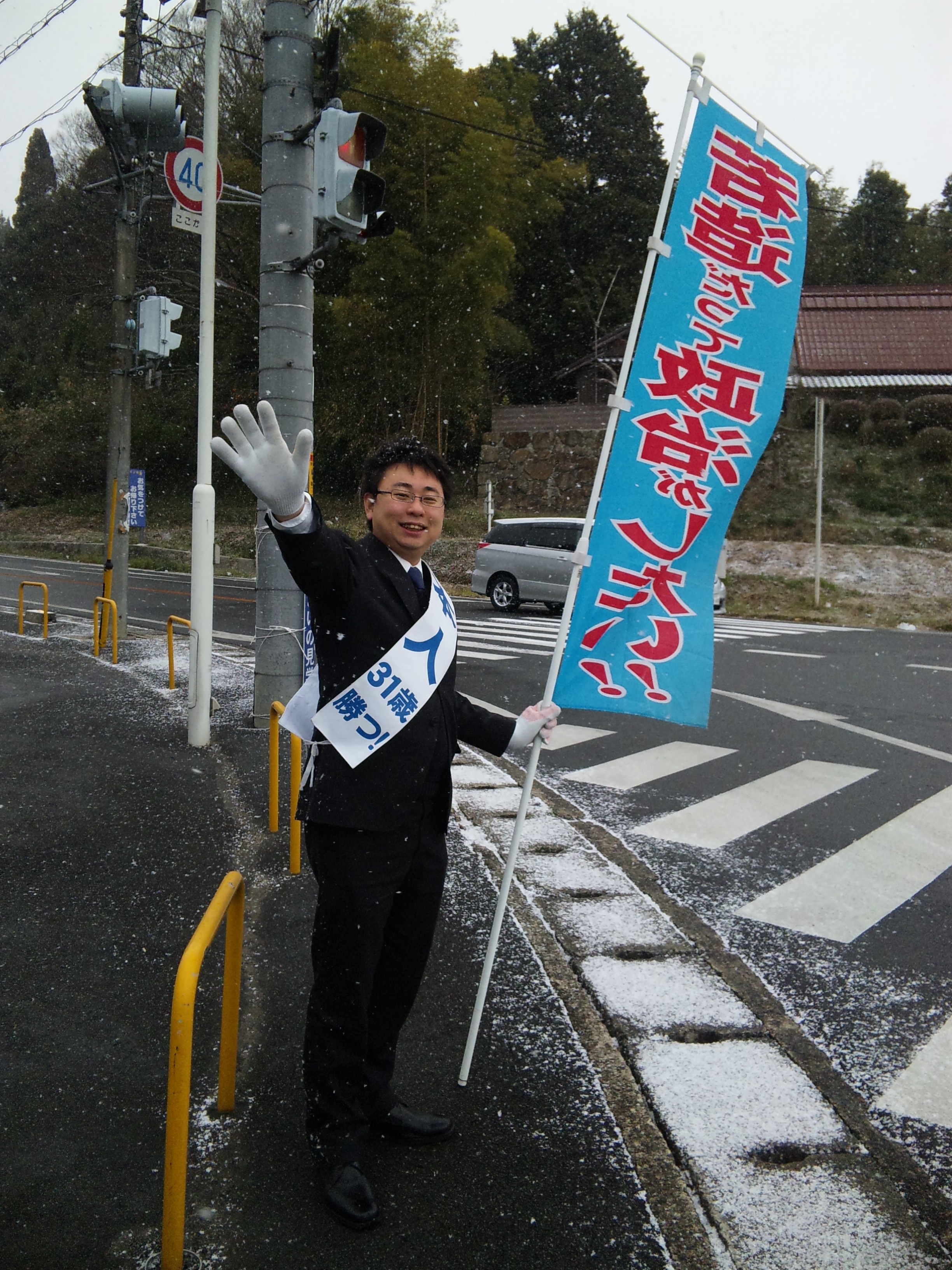篠楽交差点で朝のご挨拶をさせていただきました。雪が飛ぶ中での活動となりましたが、友人が応援に来てくれたので、心の中は暖かったです。
