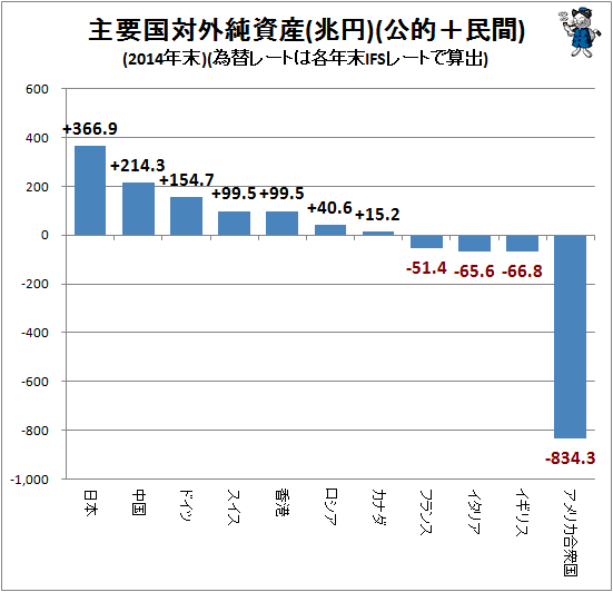 対外純資産額の多い日本、負債の多いアメリカ(中国は偽りの報告による)