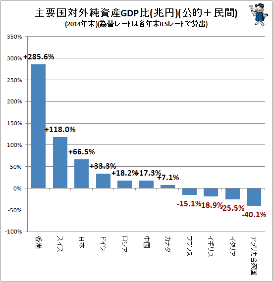 香港やスイスが相当大きな値を示している。極端な表現だが、香港の場合ならばすべての債務・債権を清算した場合、香港が1年間に稼ぐ総生産額の3倍近くを手にすることができる計算。