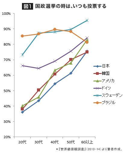 ちなみに、選挙の投票率は国によって大きく違っています。主要国について、「国政選挙の際、いつも投票する」という者の割合を年齢層別に出し、グラフにしてみました。図1をご覧ください。