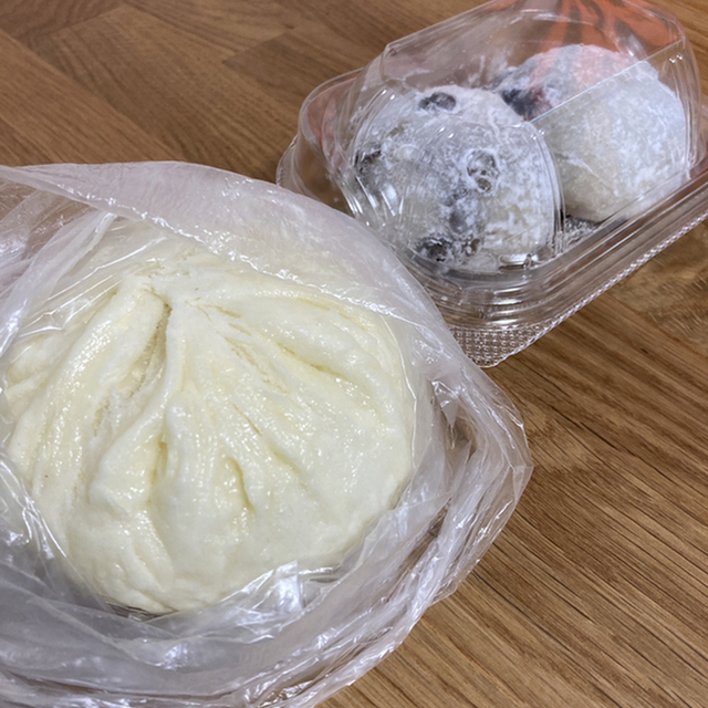 注文すると、奥から温かい状態の豚まんが出されてきた。2個購入、1個は自宅へ持ち帰り、1個はその場でいただくことに。