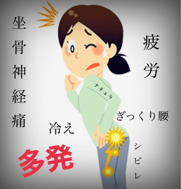 長時間の不良姿勢により肩こり、腰痛、特に「おしり」~「足」にかけての痛み・痺れ感が出ている方が多くみられます。