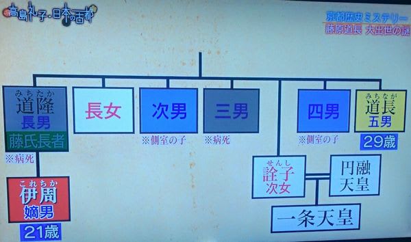 藤原道長の出世街道と生涯藤原道長(平安貴族の権力者)の出世街道藤原道長は、後一条天皇・後朱雀天皇・後冷泉天皇の外祖父です父藤原兼家が摂政になり権力を握ると栄達する藤原兼家の五男で生まれ、藤原道長は、兄道隆、道兼がいたためさほど目立たない存在だった父藤原兼家の死後、兄道隆が大酒、道兼が伝染病により相次いで病没兄藤原道隆の嫡男伊周との政争に勝って左大臣として政権を掌握したBS・TBS『高島礼子・日本の古都』番組参考&引用藤原道長(『高島礼子・日本の古都』番組のテレビ画面他引用)
