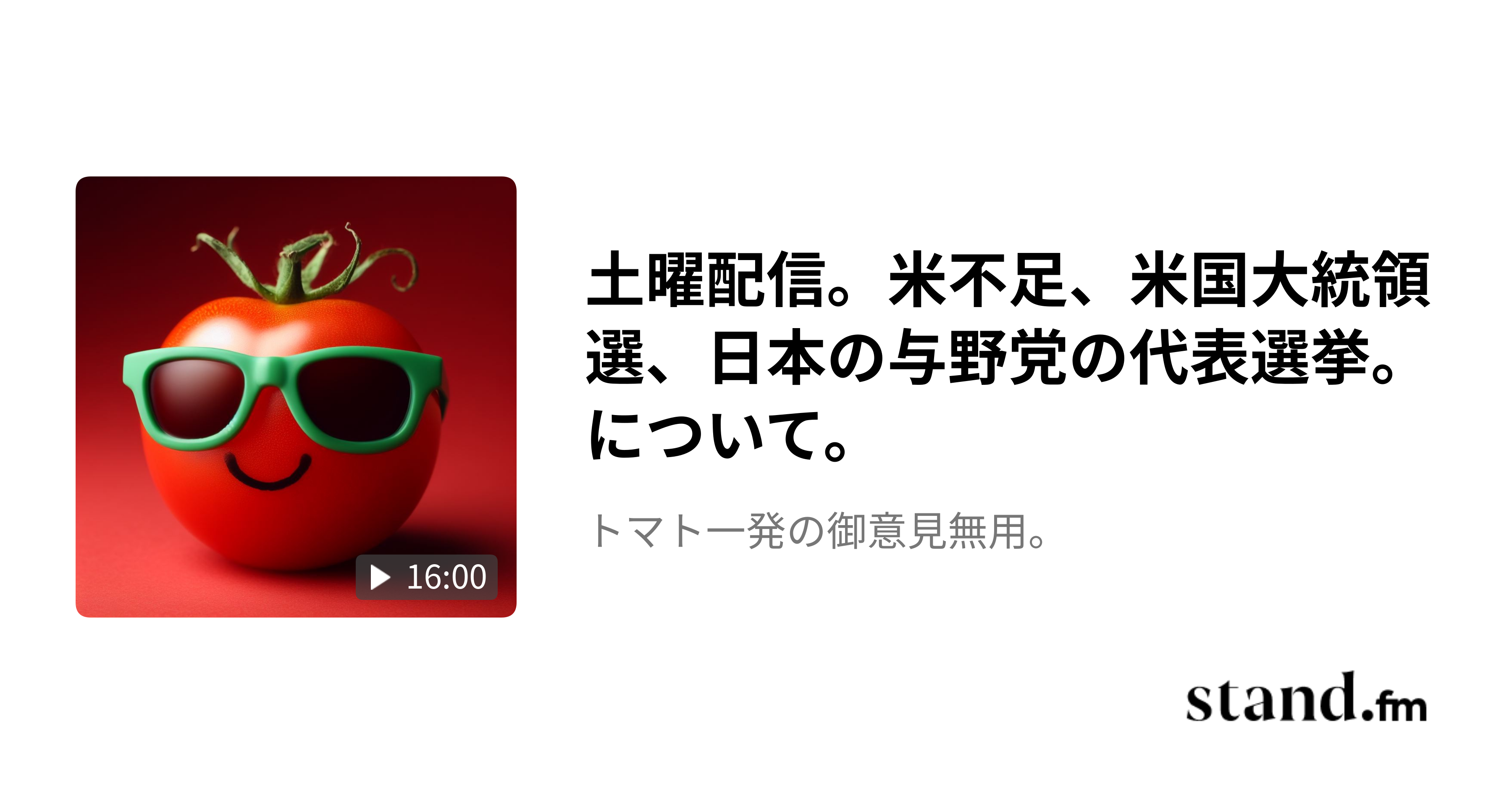 土曜配信。米不足、米国大統領選、日本の与野党の代表選挙。について。 - トマト一発の御意見無用。 | stand.fmコメ不足が起きているのか?そして、USA大統領選挙では、トランプ氏に強力な助っ人。日本の与野党の代表選は、どうなるのか?をテーマで私見を語ってます。 #コメ不足 #大統領選挙 #与野党stand.fm