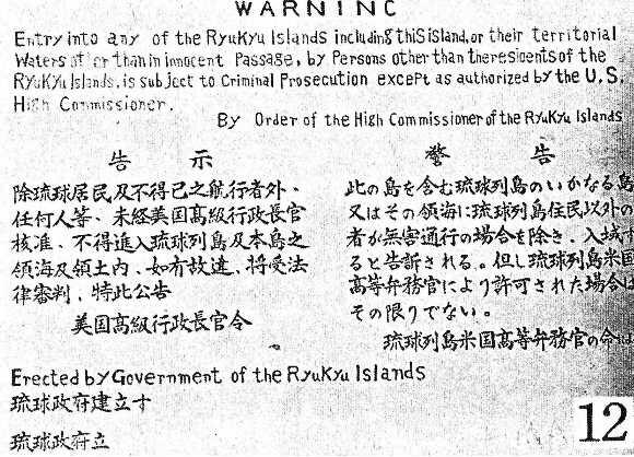 此の島を含む琉球列島のいかなる島またはその領海に琉球列島住民以外の者が無害通行の場合を除き、入域すると告訴される。但し琉球列島米国高等弁務官により許可された場合はその限りでない。