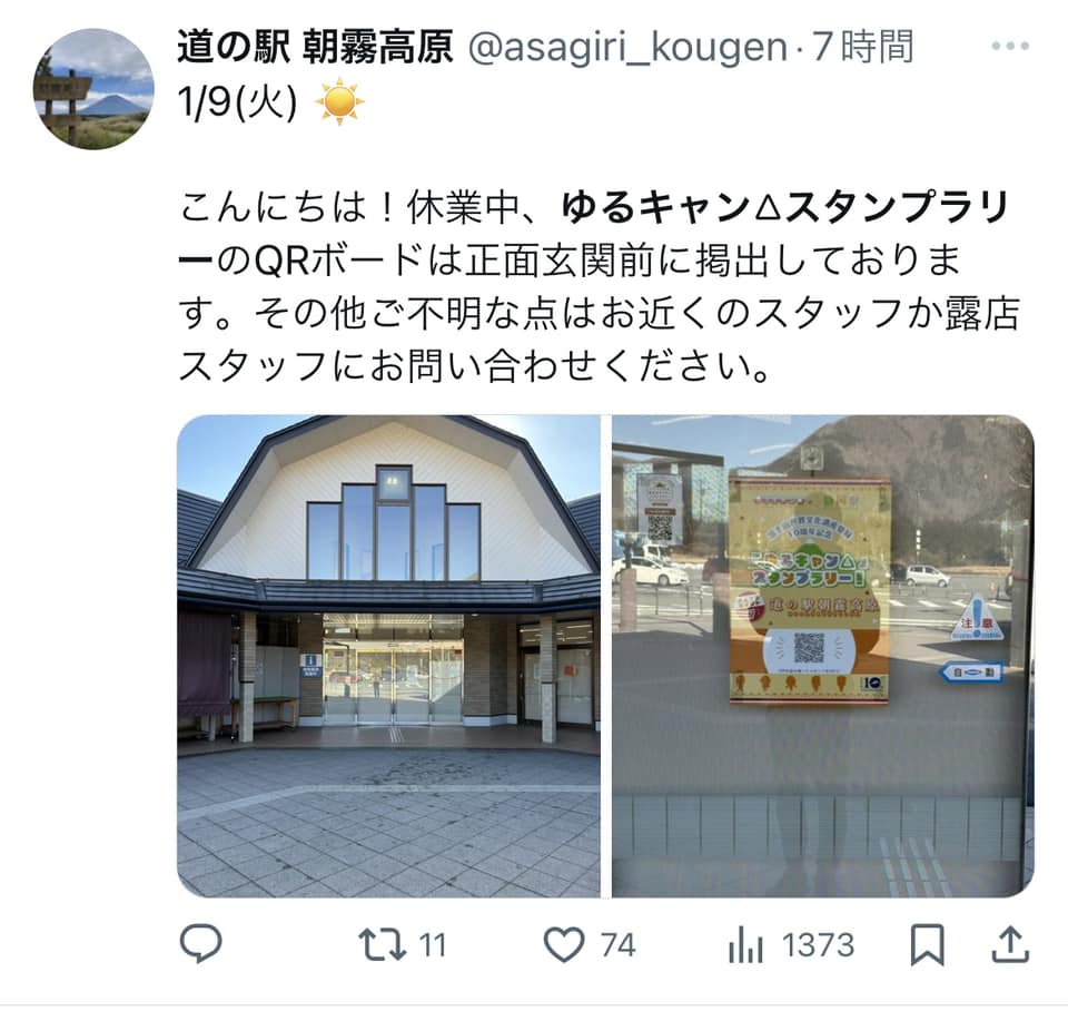 それを聞いた、同行のM田さんが、翌日に道の駅朝霧高原に交渉しに行ってくれて、「閉めた後のスタンプラリーのバーコードは、建物の外に」と言ってくれました。
